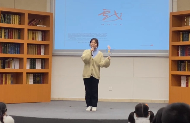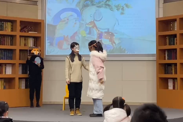 此次活动分为3个板块,首先是由干羽西同学担任这次戏剧教育课堂的故事主持人,向小朋友们富有感情地讲述了这篇故事。随后,由杨樊斌、覃子怡、杨梦真、艾依纯、彭晶华、夏梓铭同学分别任演拽拽狼、狼妈妈、鸭妈妈、小动物、月亮台主持人、小鸭子的角色,表演道具是由陈石梅、王子涵、陈晓波、何佳怡等同学共同完成,通过戏剧舞台表演的方式将故事完美呈现。孩子们随故事的发展做出了各种各样的反应,舞台与观众的情感达到了共鸣,甚至有孩子在看到拽拽狼想妈妈的情节时落下感动泪水。演员们再次将故事表演,带领孩子们感悟故事情节,当王培喜教授向孩子们提问是否能复述故事时,孩子们踊跃发言,并且将故事情节讲述十分详细,这体现了他们班级对阅读习惯的培养。