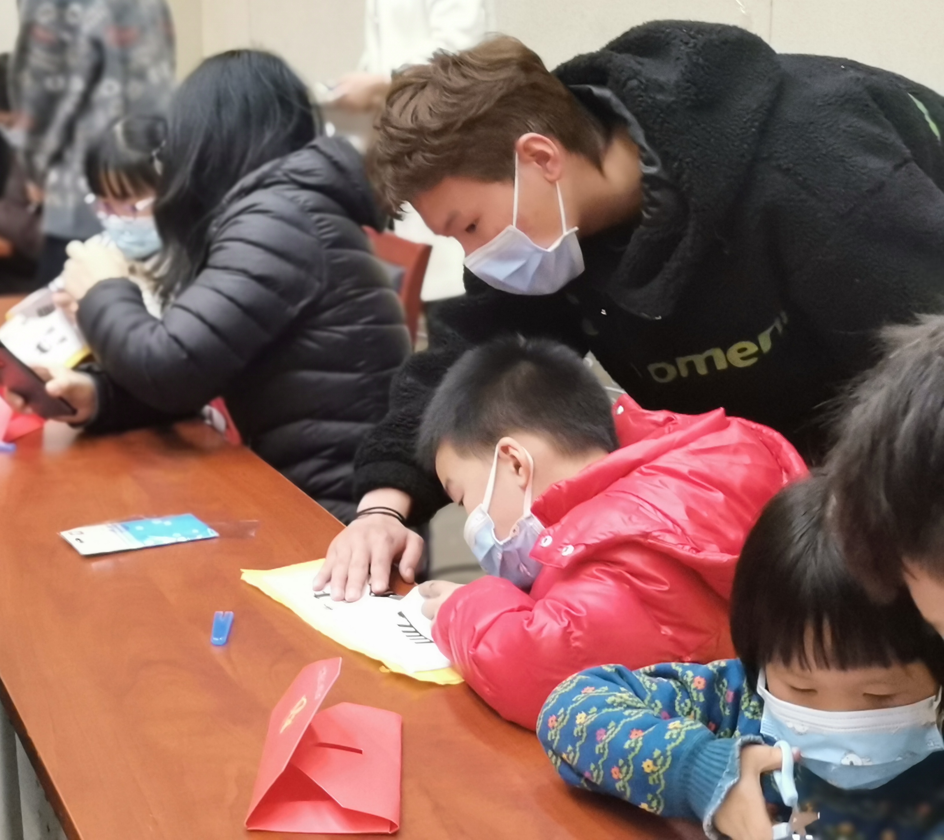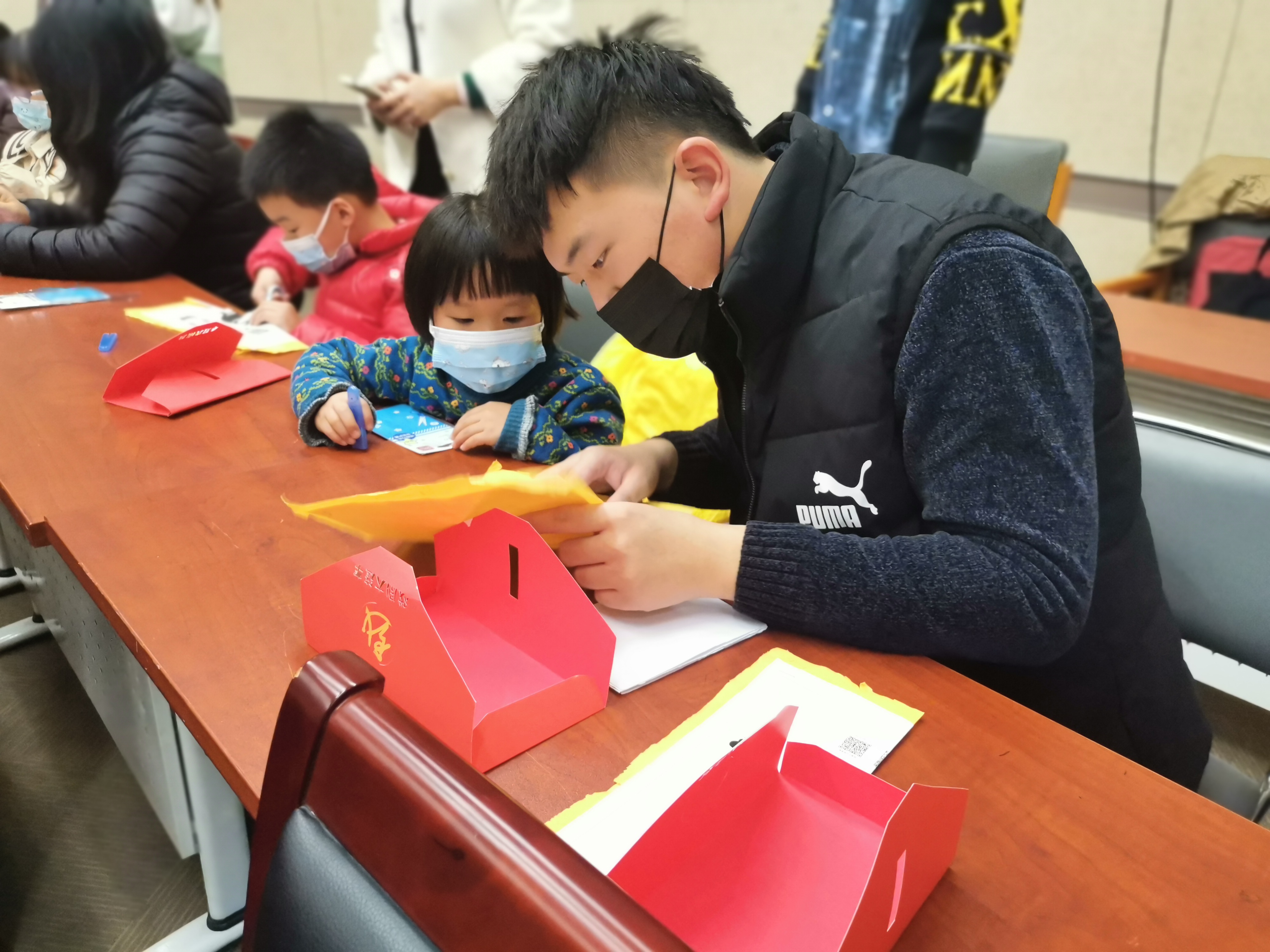 活动的第一部分就是创意剪纸。王培喜老师与小朋友们进行了互动,提问在活动开始前开始前在展览册上见到的剪纸图案都有哪些?小朋友们积极踊跃的举起小手,一个个回答问题,也激起了他们对剪纸的好奇心。现场的氛围更因为这些互动而变得热闹起来。接着戴老师为各组家庭分发了剪纸底稿、剪刀等工具,并讲解了剪纸步骤和具体要求。也是在我们志愿服务队成员的辅助下小朋友们完成了红包剪纸。