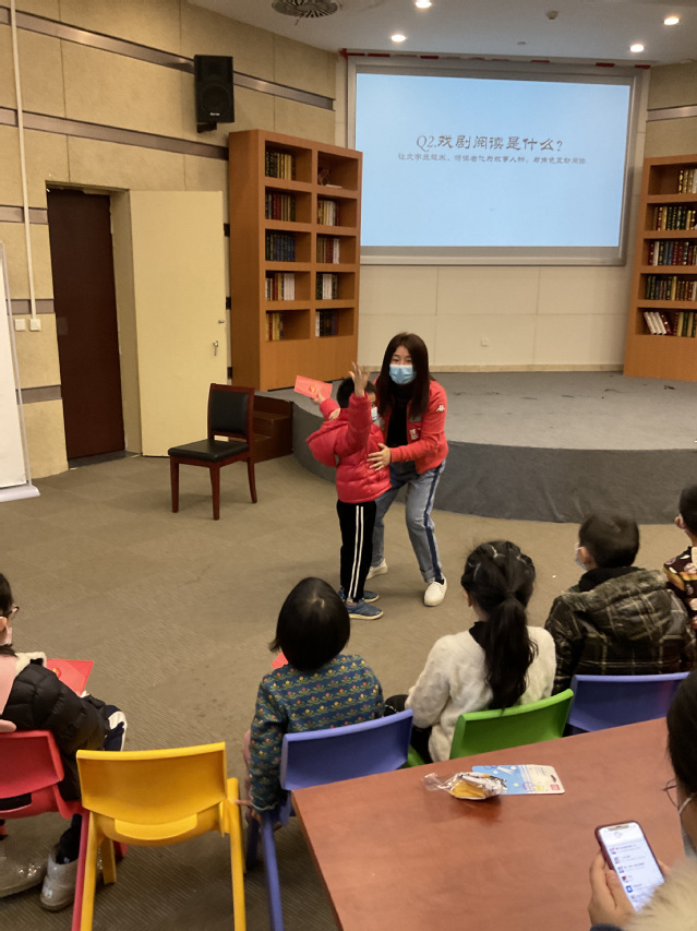 在活动的第二部分,由王老师为我们介绍了戏剧《芃芃与年兽》。创意戏剧源于创作戏剧,参与性与创新性较强。同时老师通过观察研究发现,这个活动是一个输出过程,锻炼了小朋友们的表达能力,将孩子们学到的东西用肢体展现出来,与此同时也提升了他们的表达能力,团队精神与同理心。王老师为大家介绍了《芃芃与年兽》里的主要人物年,灶王爷还有年,并邀请一些小朋友进行了角色扮演。在最后,我们播放了团队志愿者演绎的完整版戏剧《芃芃与年兽》,生动活泼的演绎将孩子们深深的吸引,认真的观看着这一部戏剧。