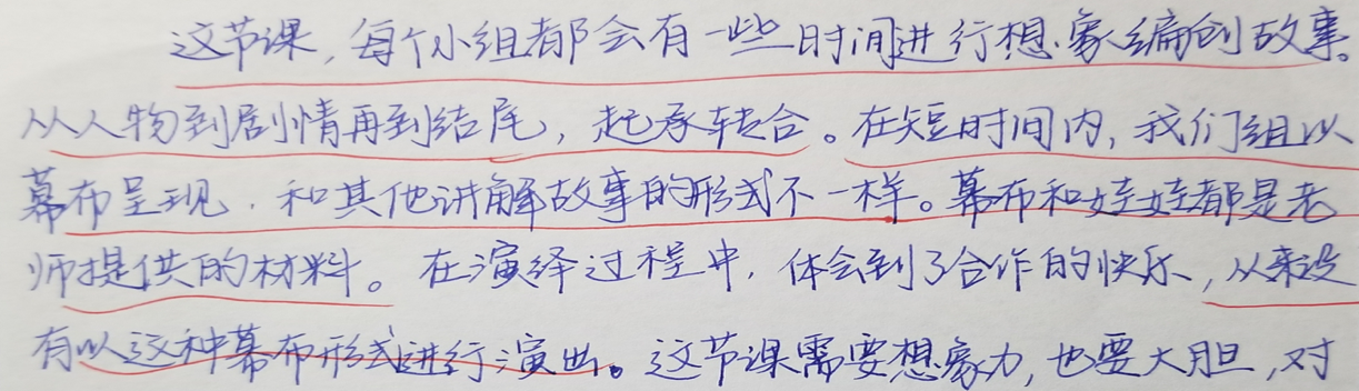 “这节课,每个小组都会有一些时间进行想象编创故事。从人物到剧情再到结尾,起承转合。在短时间内,我们组以幕布呈现,和其他讲解故事的形式不一样。幕布和娃娃都是老师提供的材料。在演绎过程中,体会到了合作的快乐,从来没有以这种幕布形式进行演出。”