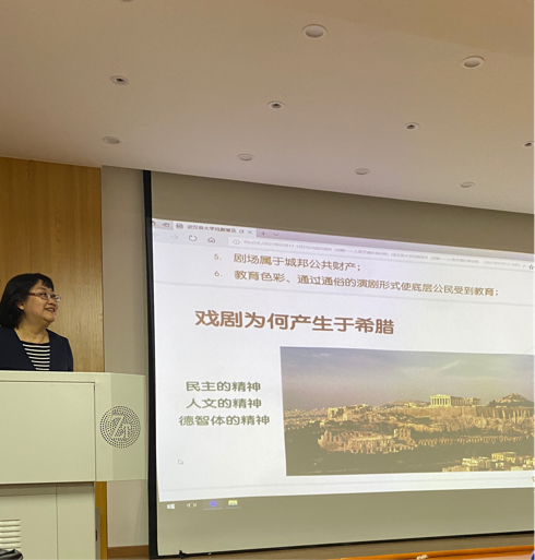 罗彤女士的报告从戏剧的起源、形式及发展,概述戏剧在中国发展的样貌,然后,聚焦世界戏剧的发源地--古希腊,通过详实的案例和丰富的图片资料,展示戏剧在古希腊的起因和发展、古希腊剧场及演出的盛况,讲解戏剧如何与古希腊文化、政治相互渗透,她讲到,戏剧具有卡塔西斯(净化)功能,好的戏剧可以净化人的心灵。