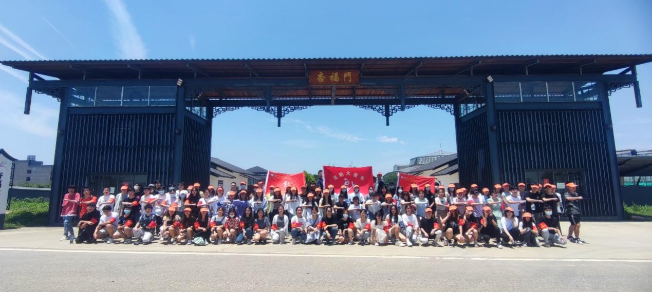 同学们来到杏福园的大门,在杏福门前留下了这次旅程的第一张大合照。同学们拉起戏剧的旗帜,戴上志愿者的袖章,摆出“前进”的姿势,“杏福”之旅在炎热的天气和同学们满满的冲劲和激情下拉开帷幕。