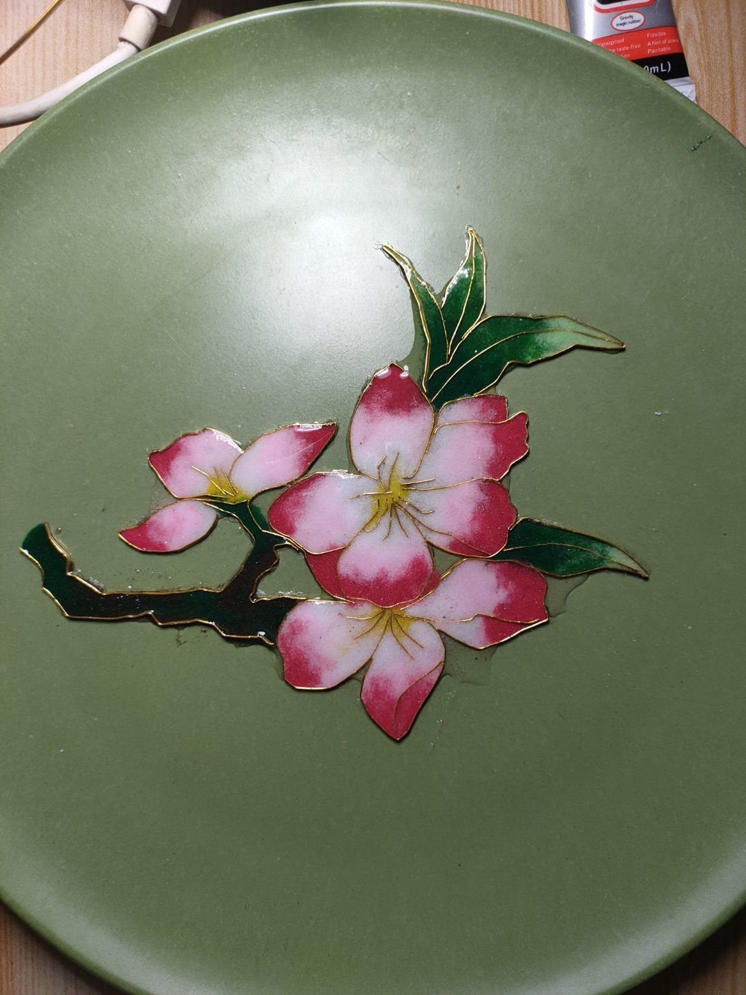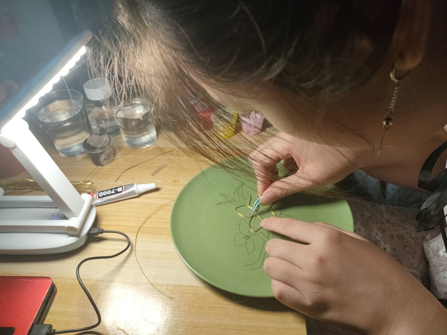 在直播过程中,颖儿老师耐心讲解、细心提示,为实践队员们再现了掐丝珐琅的制作工艺。首先,将B-7000胶水沿盘内的图案勾画,待7——12分钟,胶水到了半干状态的时候,将扁平状的金丝树立并垂直于盘底并用特制的镊子将其固定在胶水上。其中的金丝交界处不得有空隙,防止后期矿物填充物会溢出影响整体美观。