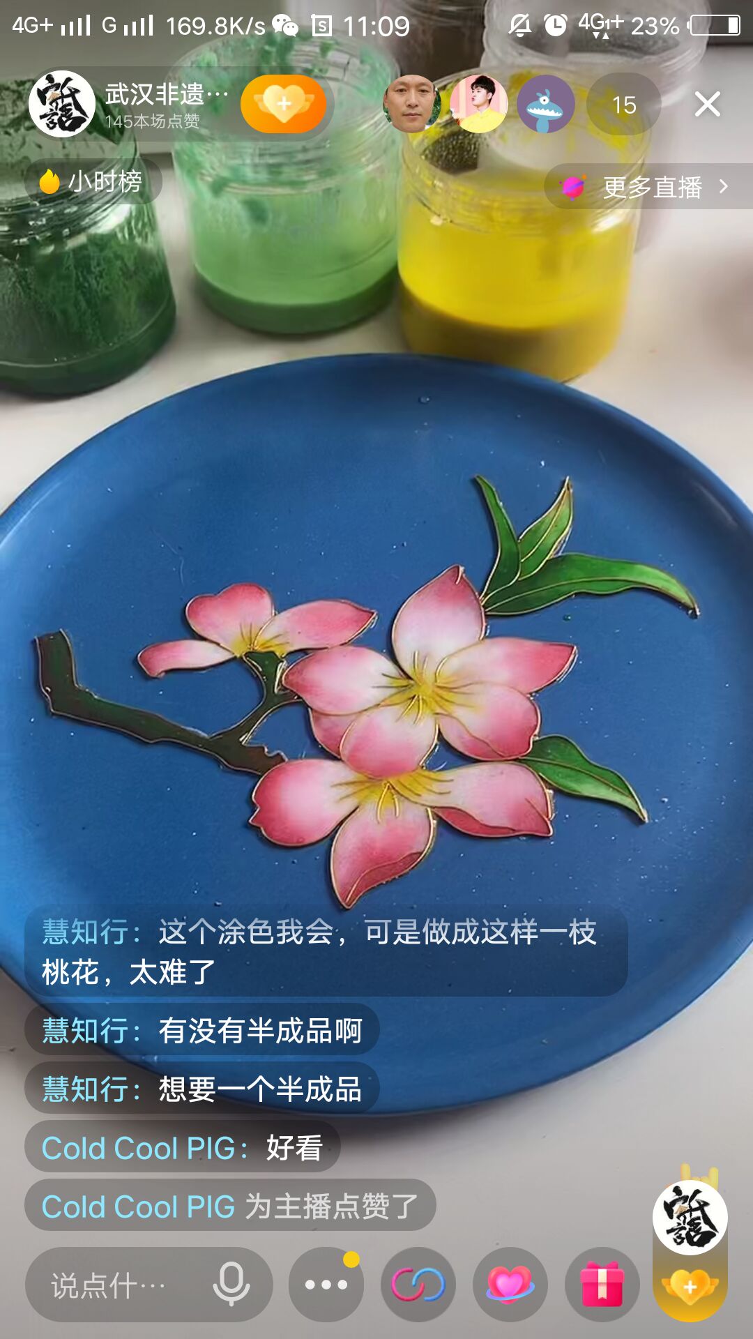 图为非遗体验馆颖儿老师在做完掐丝珐琅后的直播间截图,背景是颖儿老师教习队员们时所作的掐丝珐琅作品,直播间包括实践队员和社会公众,图片下方为队员与公众和颖儿老师的互动。中国青年网通讯员 张梦瑶 摄
