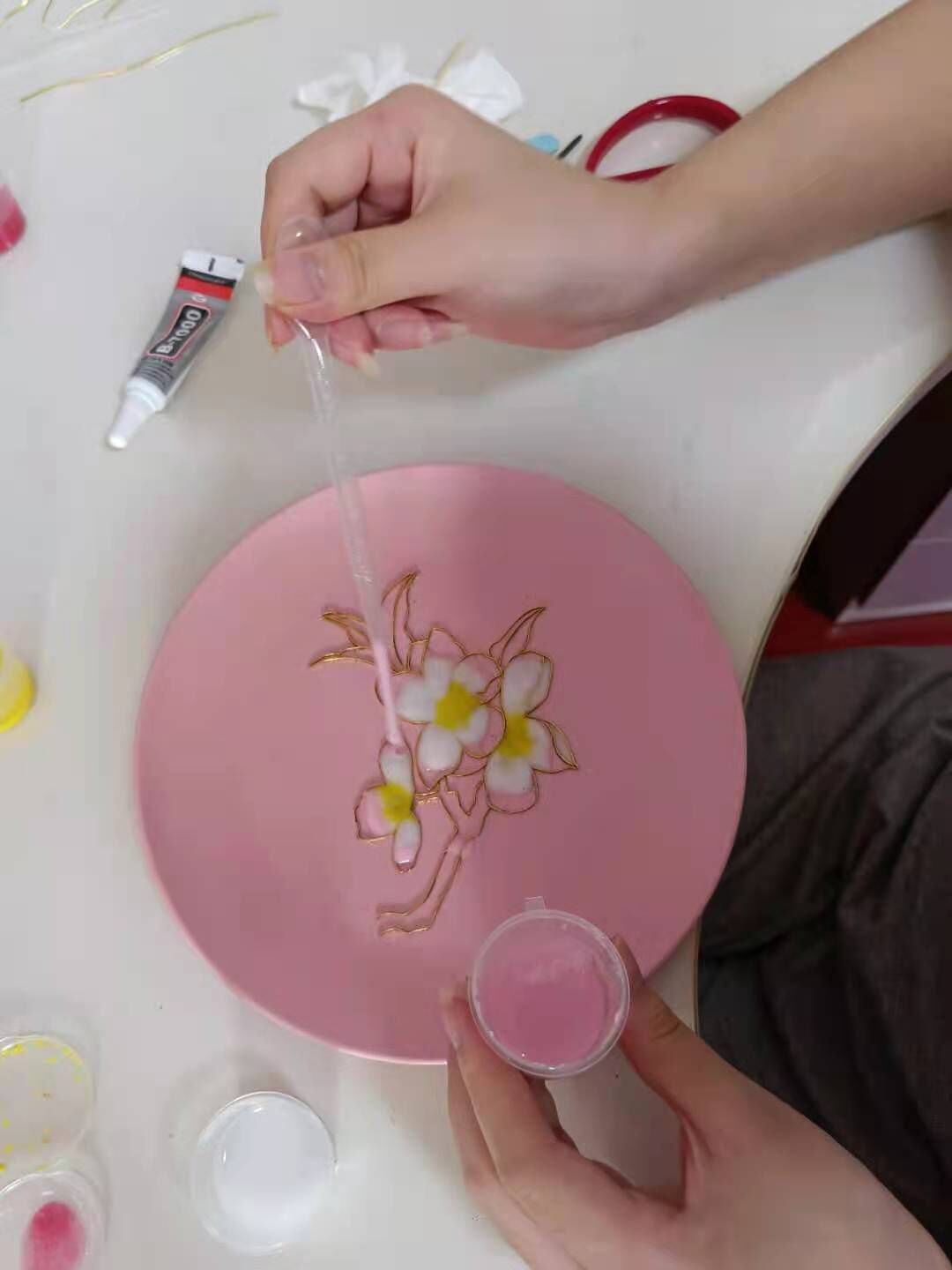 在颜料填充好后,将做好的成品放在通风处放置至全干状态,一件精美的掐丝珐琅入门级工艺品就做好了。颖儿老师逐个步骤教授,实践队员们也认真学习,大家都积极做好了自己的作品并与大家分享。